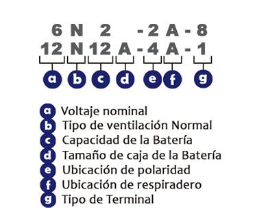 | Código | Aplicacion | Voltaje | Capacidad AH (10HR) | Medidas (Ancho x Largo x Alto) | Peso kilogramos | Polaridad | Terminal | Imagen |